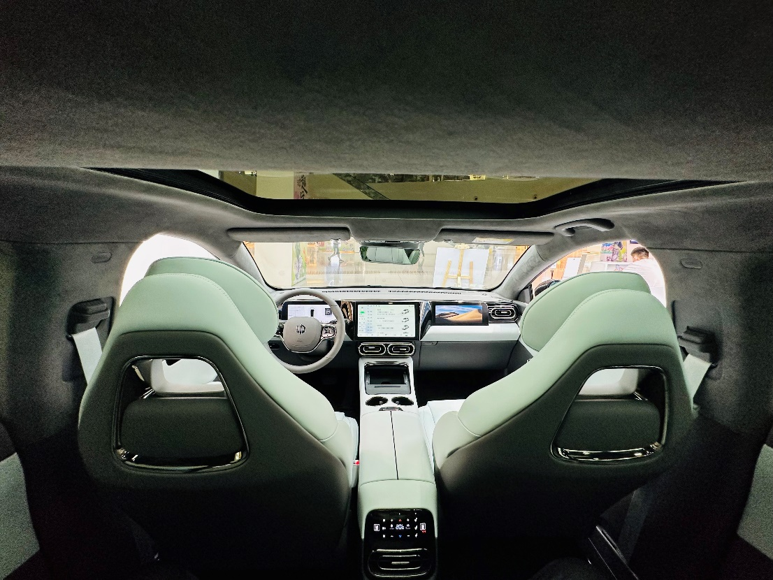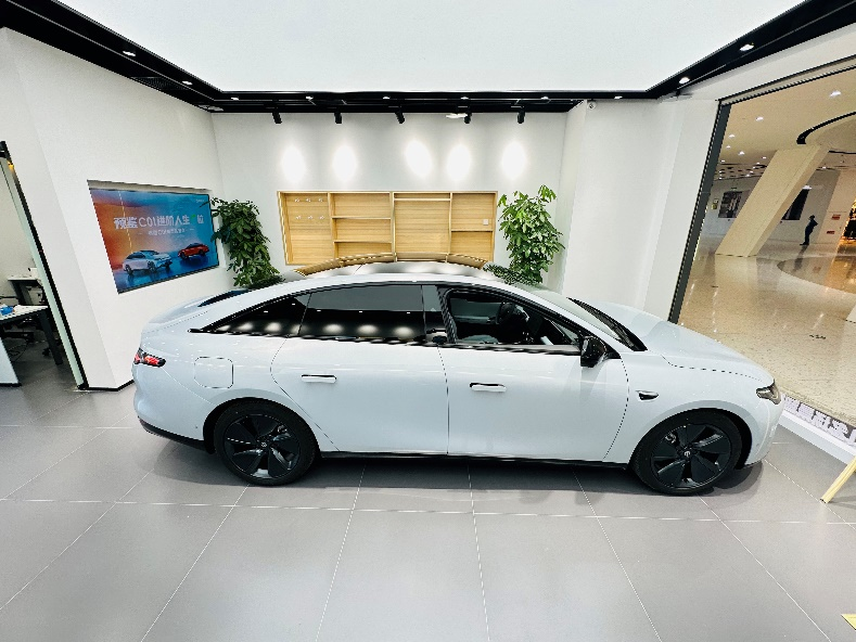 车身侧面造型较为流畅,5050mm同级超长车身,赋予一个连贯、顺滑的轿跑式线条,一方面降低行驶风阻,符合新能源调性,更呈现出亲和科技感。车顶天窗与后窗连成一体,形成一个更大的全景天幕,也是为了追求极致风阻而来。搭配无边框车门和隐藏式门把手设计,并采用了19寸半封闭式旋翼低风阻轮圈,使其风阻系数仅为Cd0.226。